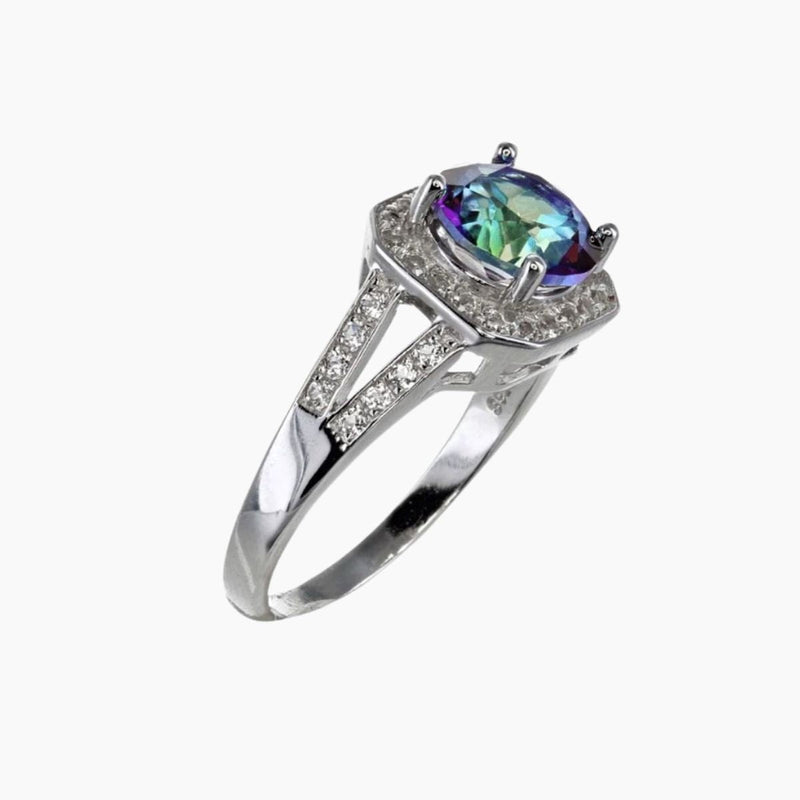 Blue Mystic Quartz Ring in Sterling Silver with White Topaz Halo