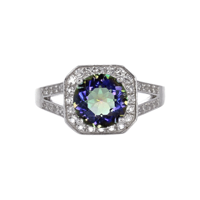 This beautiful round-cut blue mystic quartz is set inside a shimmering halo of white topaz, which accentuates the vibrant color of the quartz.