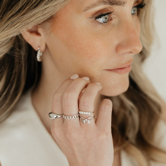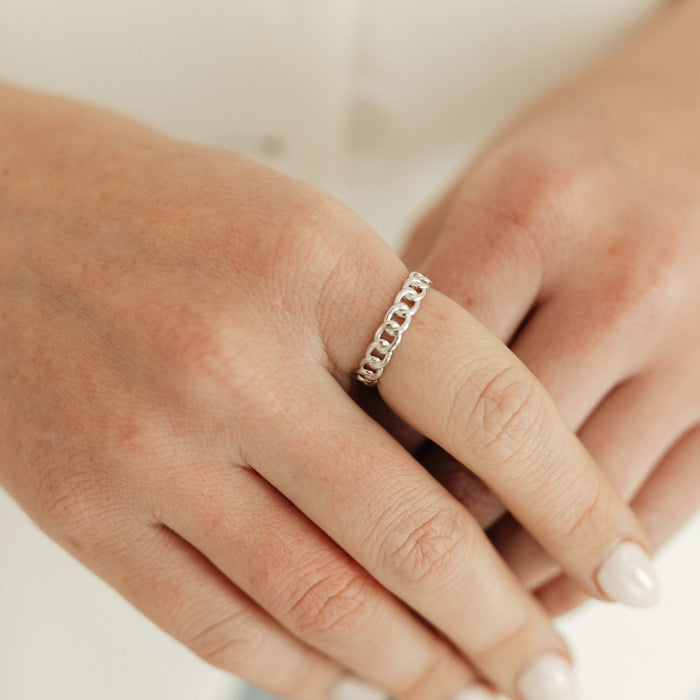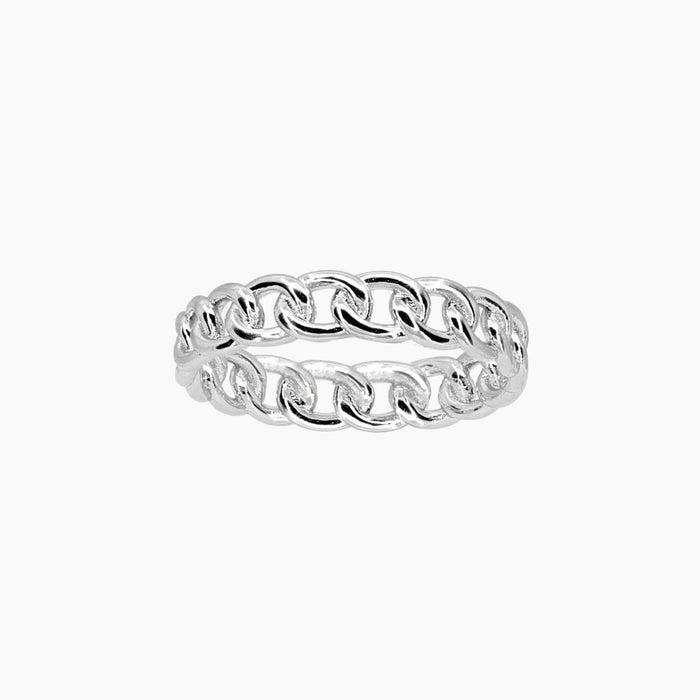 Experience luxury and elegance with the Liv Ring in Silver. This stunning curb-style ring features a protective rhodium overlay, adding a touch of sophistication to any outfit. Elevate your style and make a statement with this must-have accessory!