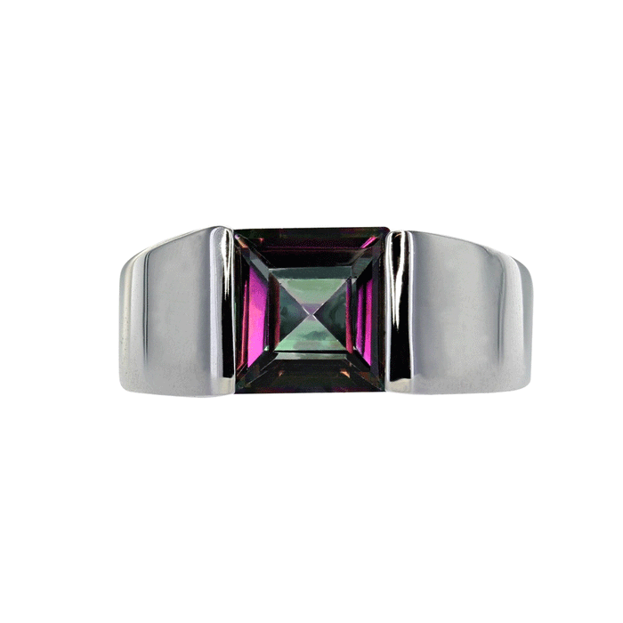 Mystic quartz in a stunning purple/green color has been cut into a beautiful square shape and placed in a modern sterling silver setting. An everyday wear, this ring is sure to be a favorite.