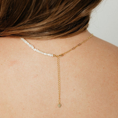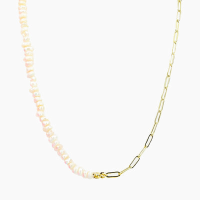 Unleash your inner goddess with the Paige Necklace! Featuring a unique design with half freshwater pearl and half paperclip chain, this necklace embodies the perfect combination of elegance and contemporary edge. Effortlessly elevate any outfit with this versatile and eye-catching accessory.