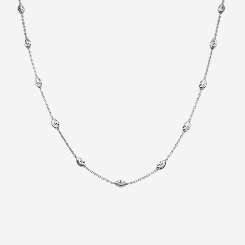 Elegant Moon Cut Stazione Bead Necklace, overlaid in Rhodium are dainty chain, graced with precision, moon cut beads.