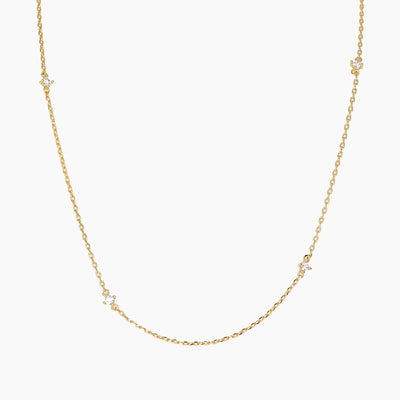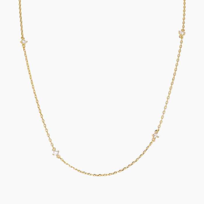 The Christina Necklace in gold will elevate any outfit with its elegant design. Featuring a station of sparkling cubic zirconia, this necklace adds a touch of glamour and sophistication to your look. A must-have addition to your jewelry collection for all occasions!