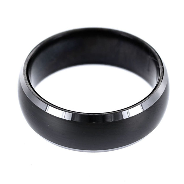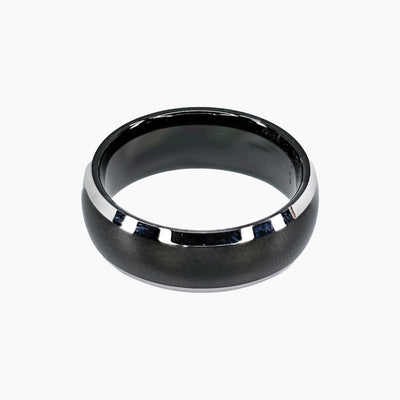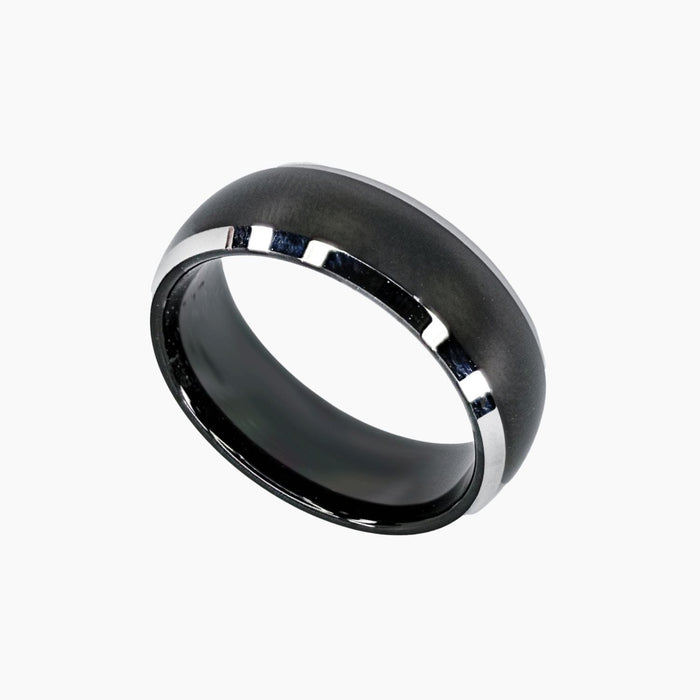 This class, black tungsten ring features a reflective black domed center that’s accentuated by contrasting white tungsten beveled edges, which give the ring a sporty and contemporary look.
